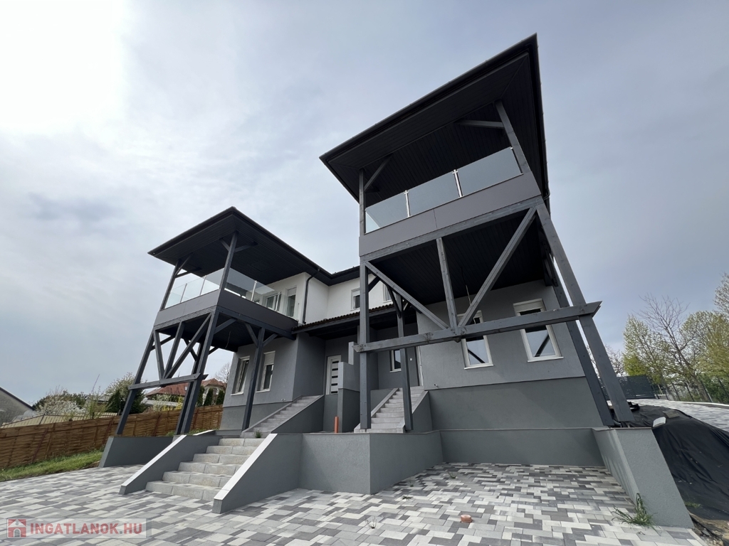 Kaposváron a Kecelhegyen, a Kőrösi Csoma Sándor utcában 2 db - egyenként nettó 116 m2-es lakórészből - osztrák technológiával épült, alacsony rezsijű könnyűszerkezetes - azonnal költözhető - új építésű ikerház eladó. A lakás a földszintjén nappali-étkező-konyha-lépcsőfeljáró, kamra, 1 szoba, fürdőszoba, külön wc, továbbá háztartási helyiség, előszoba-közlekedő kerültek kialakításra. A felső szinten közlekedő, 4 szoba, fürdőszoba-wc, továbbá egy nagy gardrób, valamint az utca felé néző szobából nyíló fedett, elegáns terasz található, amely alatt 1 db személygépkocsi tud parkolni. A lakás fenntartási költsége a felhasznált építőanyagok és műszaki megoldások miatt kedvező - a fűtés padló fűtéssel - hőszivattyúval megoldott, továbbá a nappaliban légkondicionáló is felszerelésre került. Telek: 535 m2