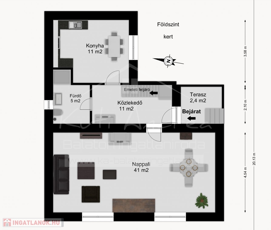 • Lakóépület elosztása nagyon jó, hisz lent található egy tágas nappali, konyha fürdő, előszobával és fent kap helyet 3 szoba fürdővel és egy gardróbbal. Itt azért megjegyezném, hogy - mivel a ház olyan beleszeretős – abban az esetben ha olyan igény merülne fel, hogy lent is szükség lenne egy hálószobára, akkor a nappaliban megoldható, hogy egy részét leválasszák, mert az eredeti terveken ez volt a koncepció.