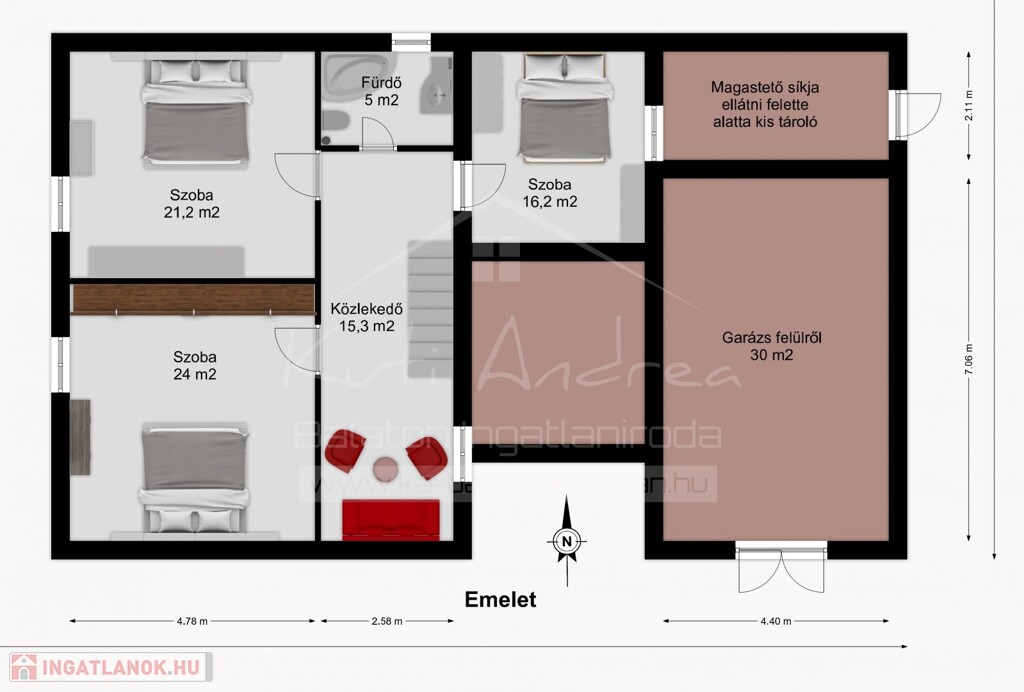 Az emeleti rész felett további pakolásra alkalmas tetőtéri rész található.