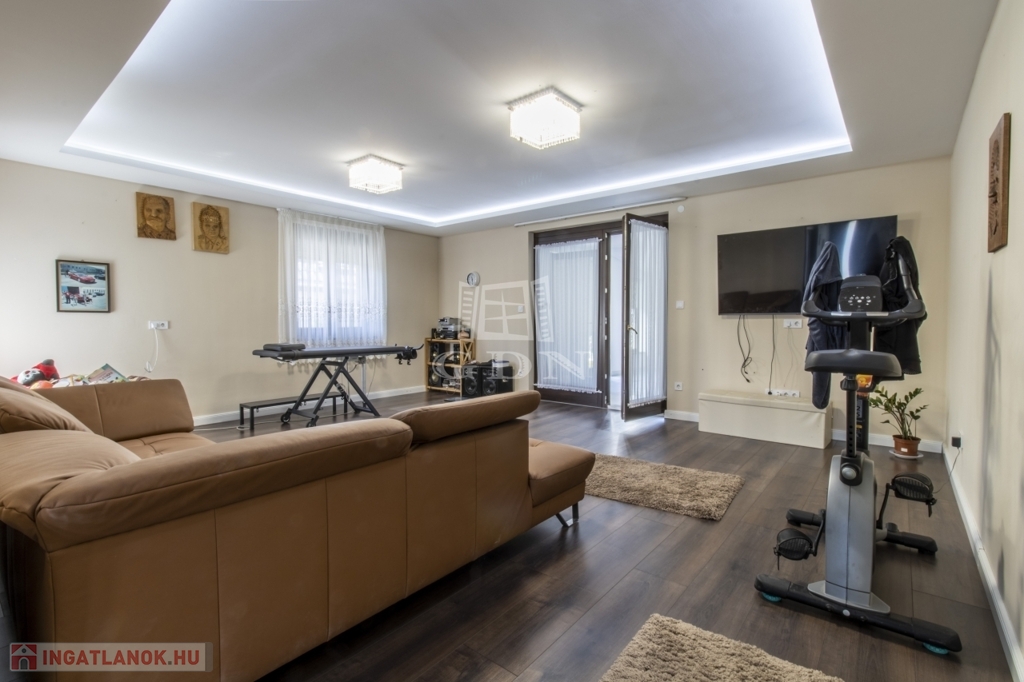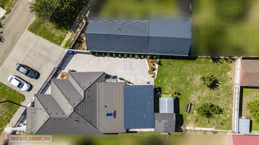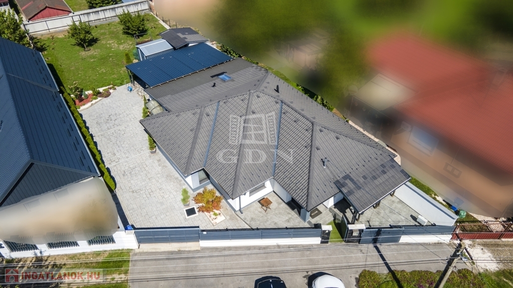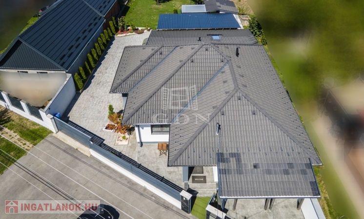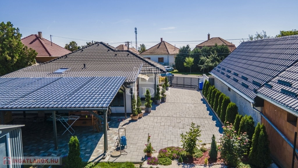 Az udvar részét képezi a 60 nm-es fedett terasz, mely egyben kocsibeálló is, valamint egy kinti zárt grillező és 3 tároló helyiség.