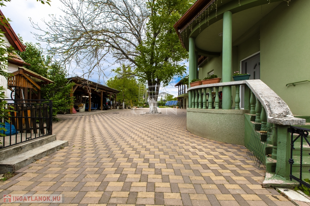 Az ingatlan megközelítése elektromos kapun történik, biztonságért riasztó illetve kamera rendszer felel.
