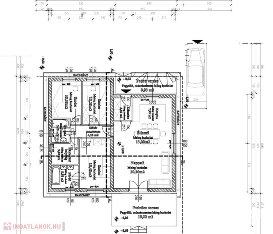 -9nm fedett terasz a bejárat, 18nm sima terasz a nappali mentén