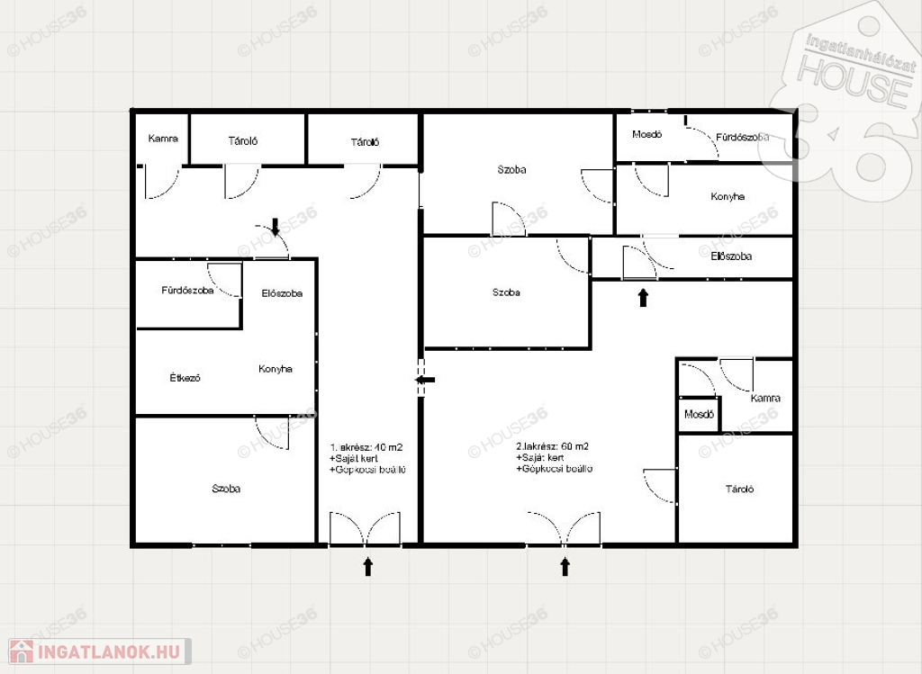 - 1.lakrész: 40 m2 : 1 szoba, konyha+étkező, előszoba, fürdőszoba