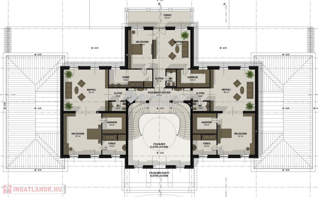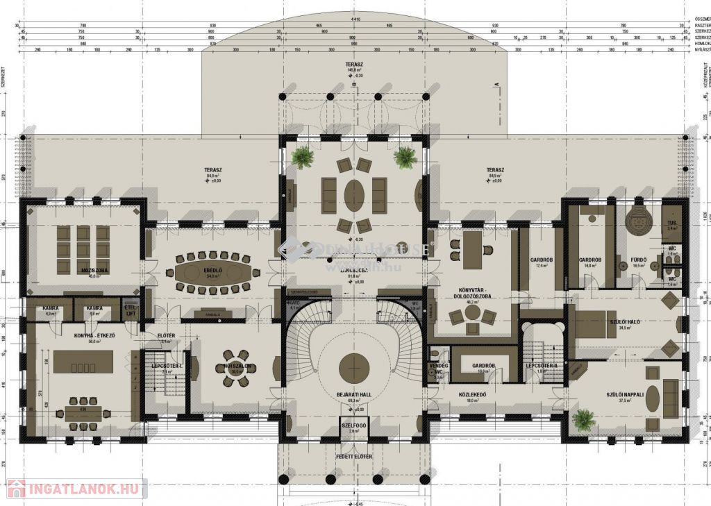 - Az épületet hatalmas teraszok veszik körül. A területen városi víz, villany és a gáz is megtalálható.