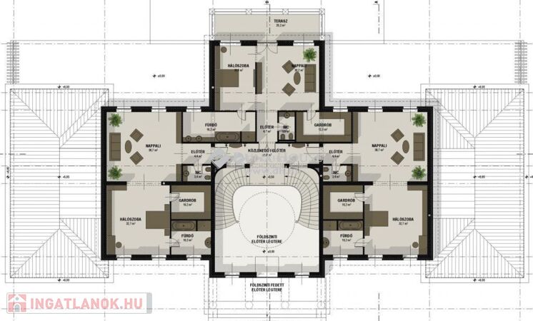 - A felső szintre 2 db íves lépcső vezet fel, három lakrész található, melyben nappali, háló és fürdő lett tervezve, ez 302 nm-es.