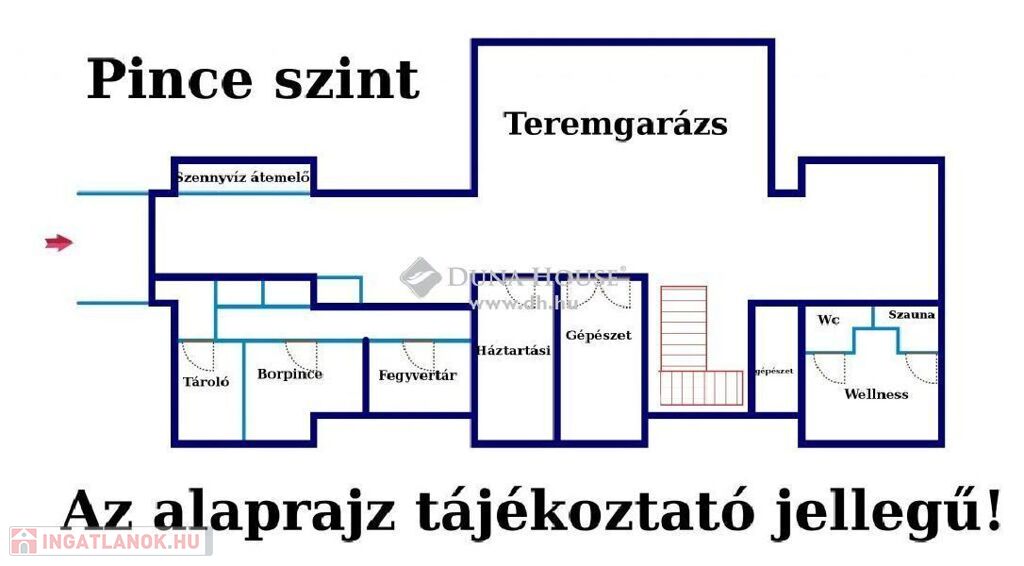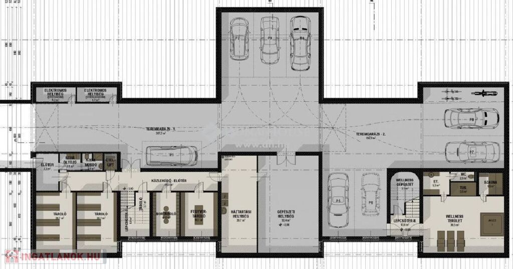 Az épület alatt 638 nm pince található, melyet széles, fűtőszálas lejárón lehet megközelíteni. Nyolc autó beállására van lehetőség.
