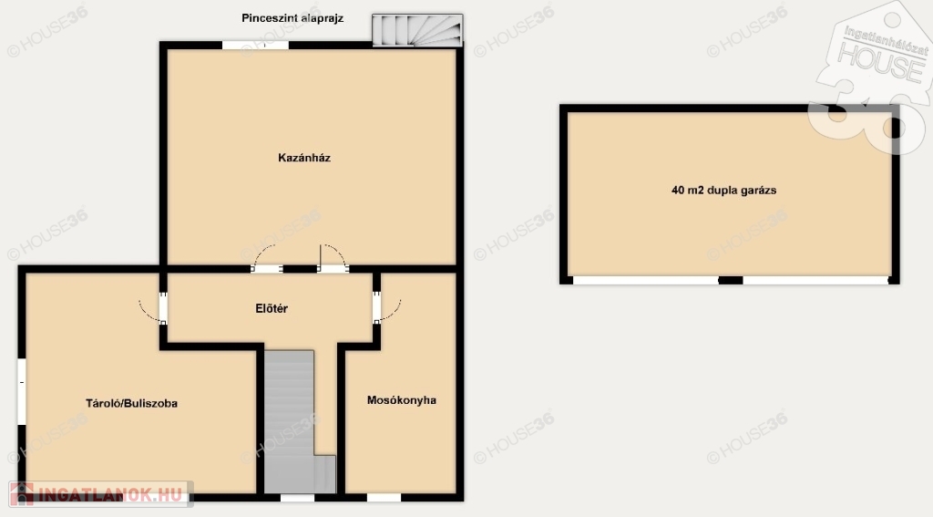 -pinceszinten mosókonyha, kazánház, tárolók, buli szoba