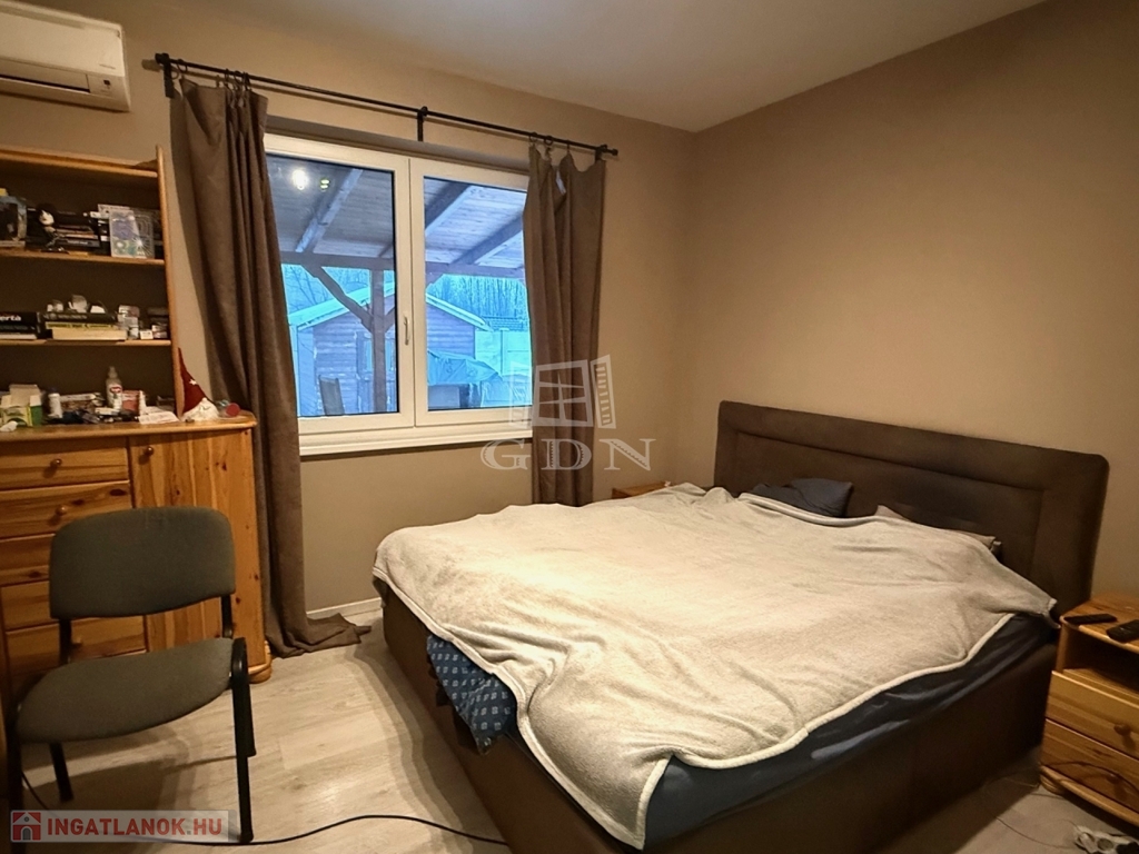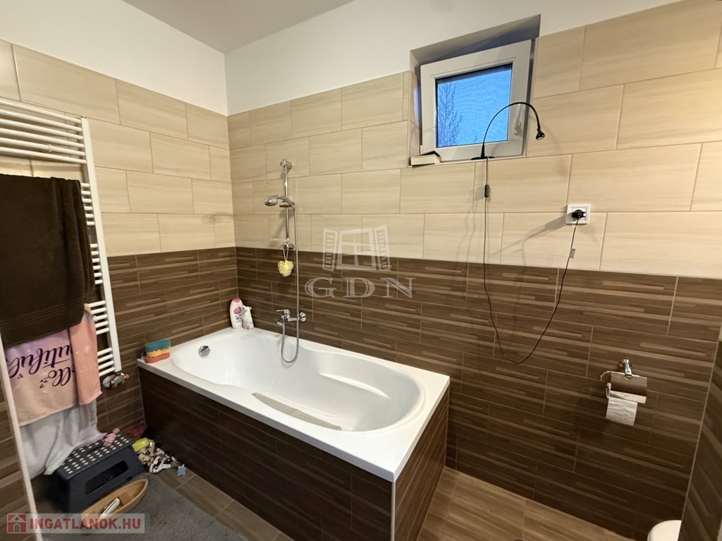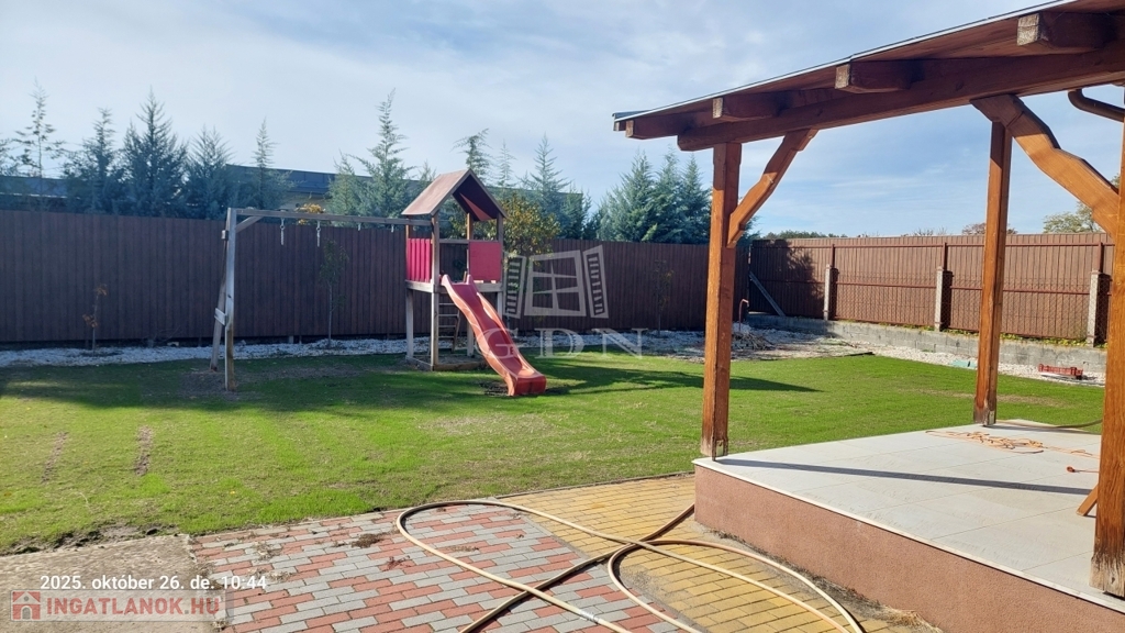 A kert újonnan füvesített, öntözőberendezéssel ellátott, mely fúrt kútról is üzemeltethető. A telken található még fedett gépkocsibeálló, kerti tároló, kis gyermekjátszótér. Az ingatlan tehermentes, 2-3 hónap múlva birtokbavehető.