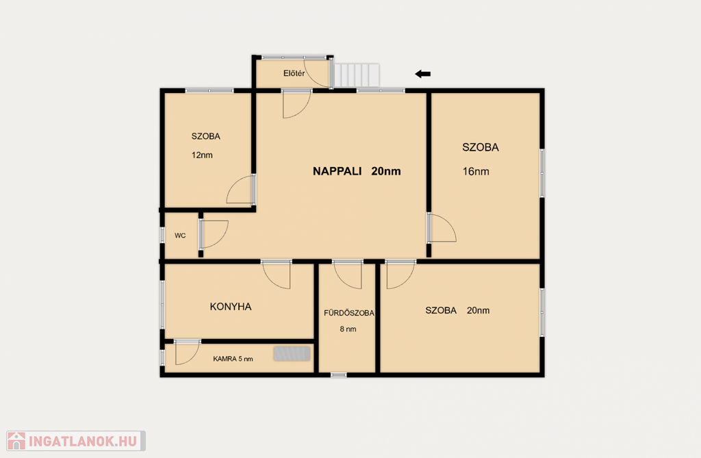 A ház mellett elhaladva érkezünk az előtérbe, ahonnan belépve a tágas, világos nappali fogad, ez a ház központi tere, ahonnan az összes többi helyiség nyílik: a két nagyobb, utcára néző szoba, a fürdőszoba, a konyha, egy külön wc, és a kisebbik szoba.A konyhához egy kamra is tartozik, innen lehet feljutni az egész épület fölött elterülő padlásra.