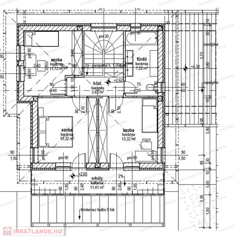 - emelet: közlekedő, fürdőszoba, 3 db hálószoba, WC, erkély