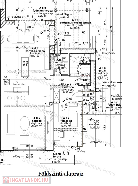 - Földszinti helyiségek: amerikai konyhás nappali 54,6 m2, szoba 9,56, előszoba 6,88 m2,Tusoló-WC 3,38 m2, háztartási helyiség 1,9 m2, lépcső 5,85 m2, bejárat 2,57 m2, teraszok 25,5 m2