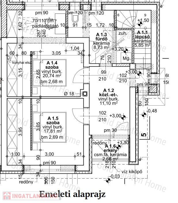 - Emeleti helyiségek: szoba 20,74 m2, szoba 17,81 m2, fürdőszoba 8,73 m2, közlekedő 11,1 m2, erkély 2,66 m2