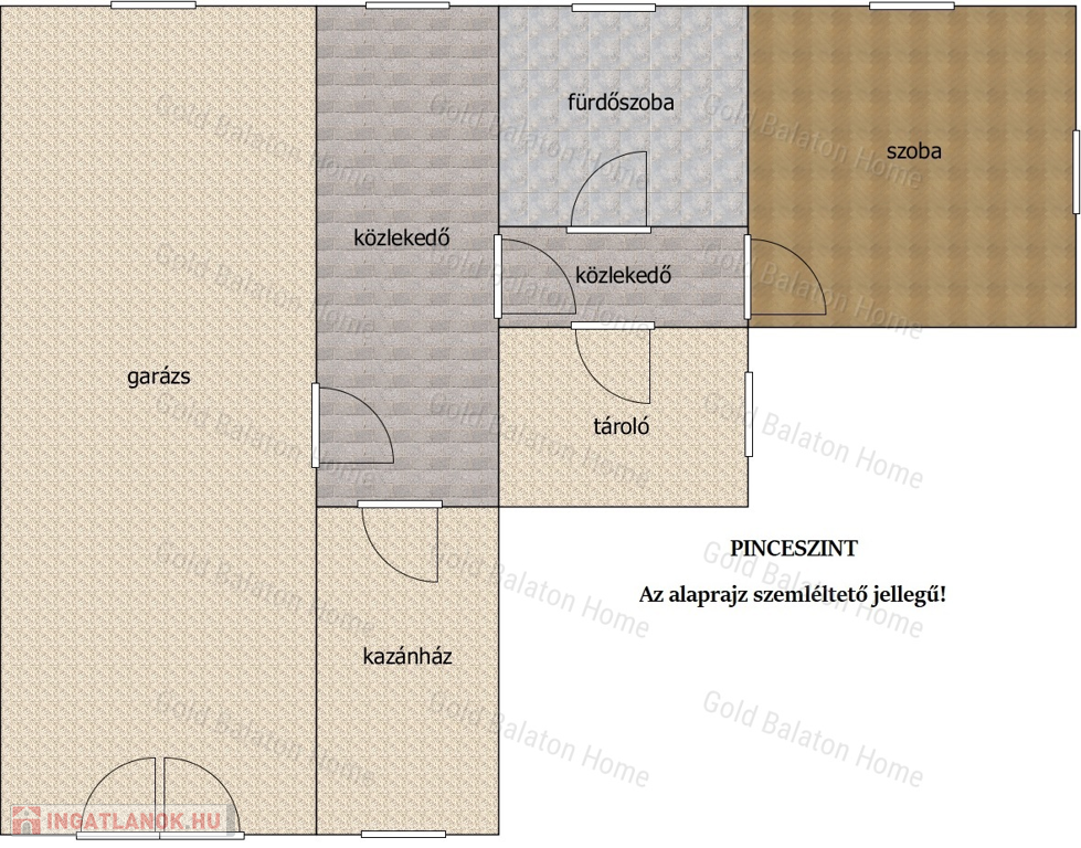 - Pinceszint helyiségei: szoba, fürdőszoba, közlekedő, tároló, kazánház, garázs.