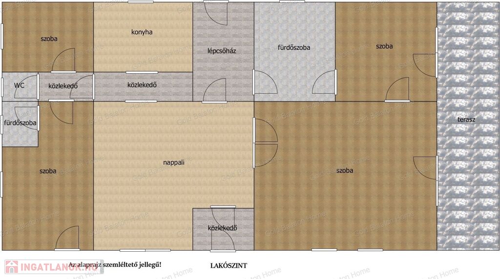 - Lakószinti helyiségek: nappali étkezővel, konyha, kettő szoba, fürdőszoba, közlekedők, lépcsőház, fedett terasz, és egy külön bejáratú apartman.