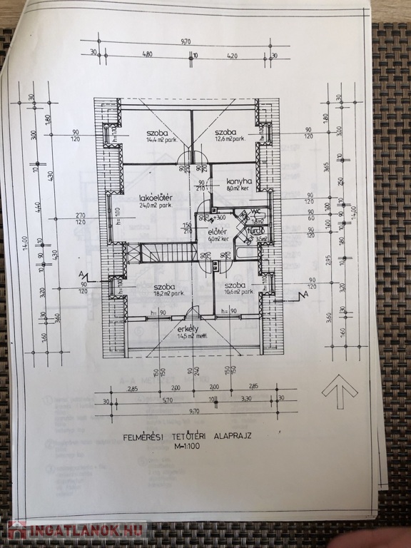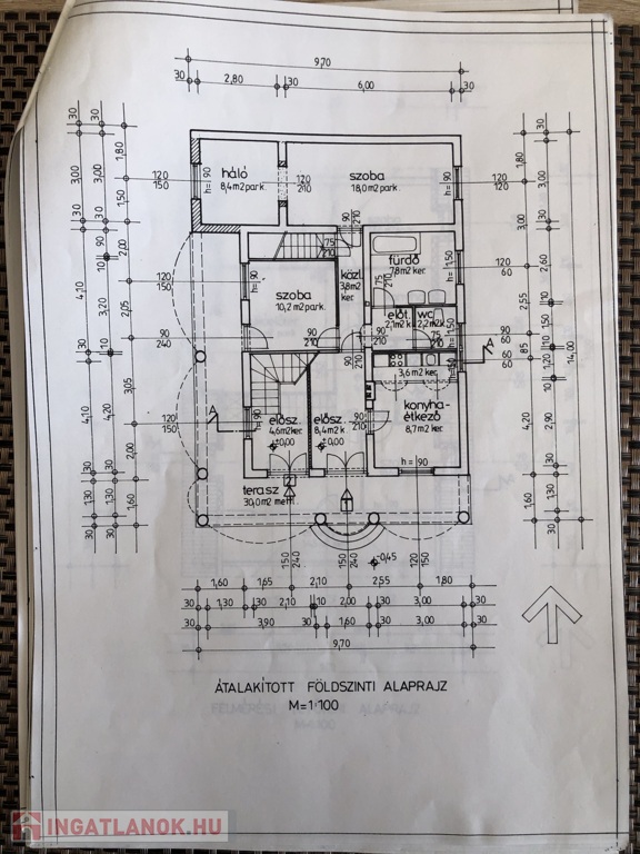 • Földszint (110 m²): Étkezővel ellátott nappali, konyha, 2 szoba, fürdőszoba, külön WC.