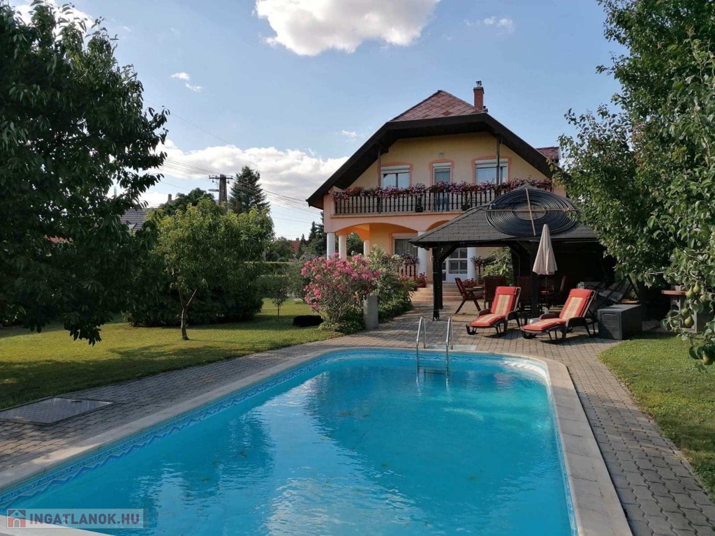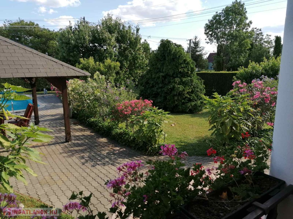 • Telek: 1000 m², gondozott udvar, grillező fedett pavilonnal, 7,5 m x 3,5 m-es medencével (gépészeti aknával).