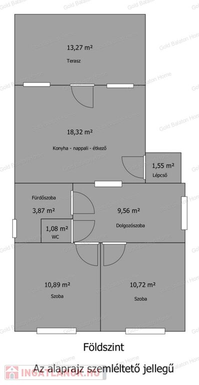 - földszint: amerikai konyhás nappali – étkező, teraszkapcsolat, 2 hálószoba, dolgozószoba, fürdőszoba, WC