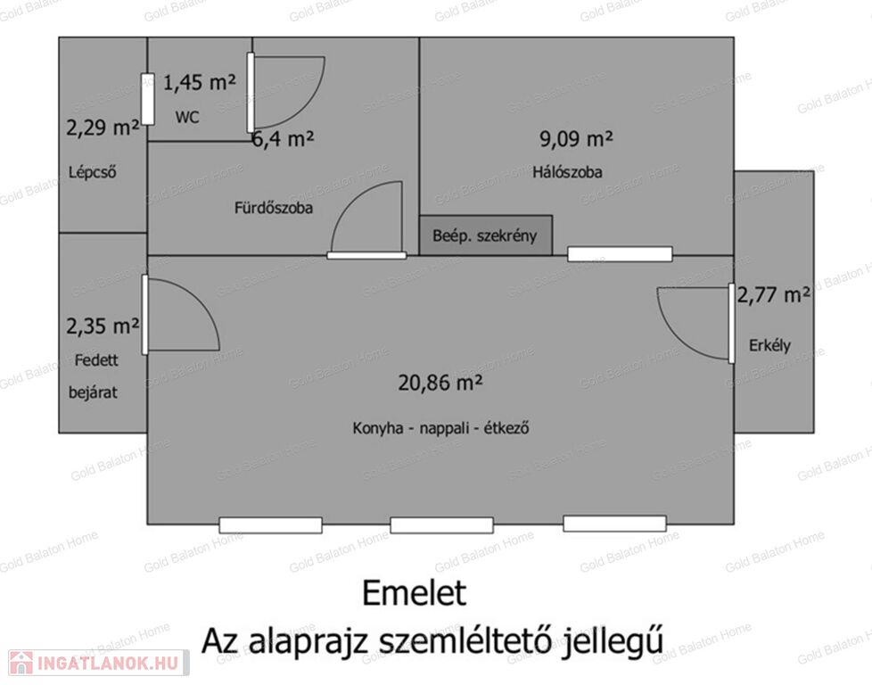 - emelet – kívülről – külön bejáraton át közelíthető meg: amerikai konyhás nappali, erkély (a befejezése az új tulajdonosra vár), hálószoba, fürdőszoba, WC