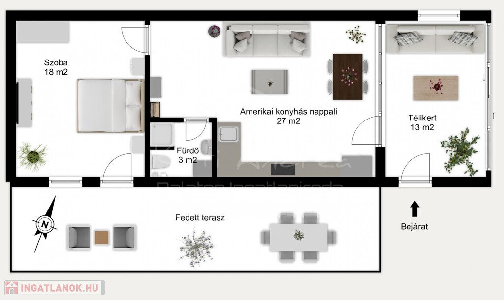 A ház fűtött alapterülete 61 m², amely magában foglal minden belső teret – a télikertet is –, a terasz kivételével. A balkon természetesen további kényelmes kültéri életteret biztosít.