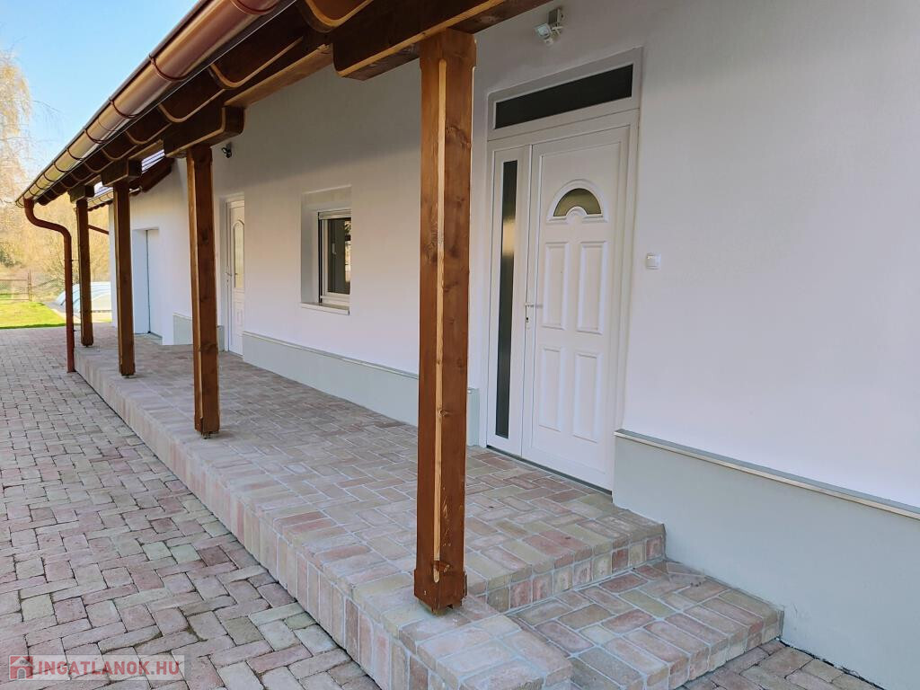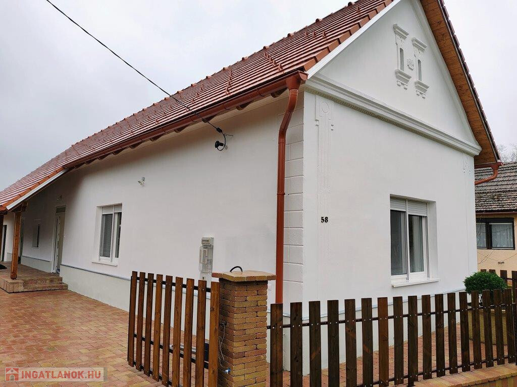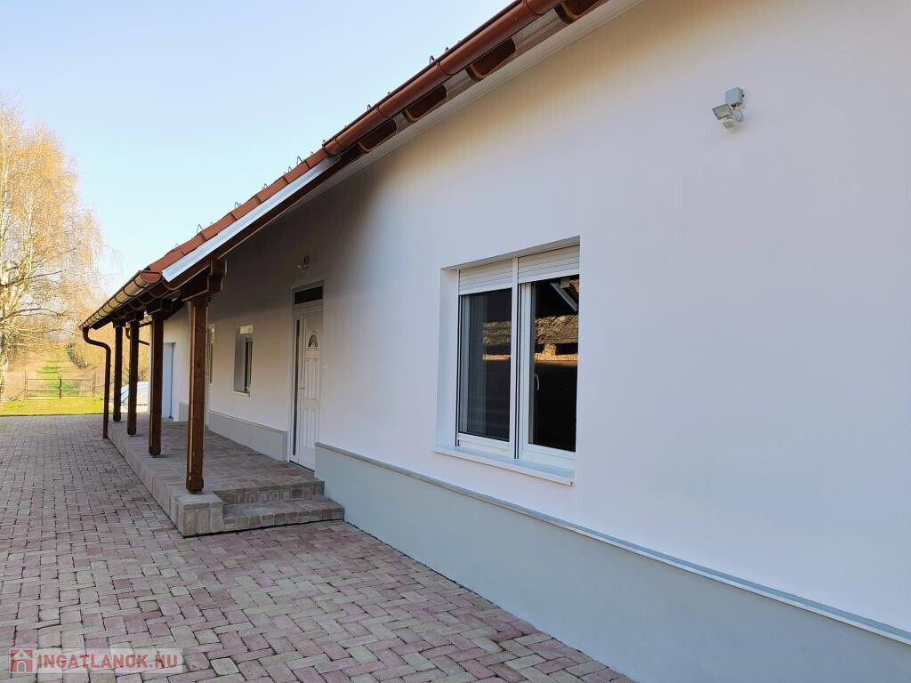 Kaposvártól 15 km-re, Kisasszondon, egy átmenő forgalomtól mentes, csendes faluban belterületen kínáljuk megvételre ezt a teljes körűen és igényesen felújított parasztházat. Lakóterülete 72,5 m2-es, ehhez adódik még a 15 m2-es kazánház és a 33 m2-es garázs. Bejárata oldalt, a 16 m2-es a fedett teraszról nyílik, ahol az előtérbe lépünk. Innen juthatunk jobbra a két tágas szobába, balra a konyhába, vagy a szemben elhelyezkedő fürdőbe. A konyha mögött találjuk a kazánházat, ami méretéből adódóan remek tároló, illetve háztartási helyiség, praktikusan külső ajtóval is ellátva. A ház 1914-ben épült 50 cm vastag jól szigetelő téglafalakkal, modernizálása most fejeződött be. Felújítása mindent érintett: új a tető Bramac cseréppel és 30 cm vastag födémszigeteléssel, új műanyag nyílászárók kerültek be, az ablakok redőnnyel, szúnyoghálóval, és két bejárati ajtó, új minden burkolat, kicserélték a villany-és vízvezetékeket. Új vegyes tüzelésű kazán gondoskodik a fűtésről új radiátorokon keresztül, de a kazánházban van gázkazánra való csatlakozási lehetőség - gázcsonk a telken belül -, valamint vízlágyító előkészítés is. Két felújított kémény is rendelkezésre áll. Mosógépet, szárítógépet beállíthatunk a kazánházban is, de a fürdőben is. A fürdőben kád és zuhanyzó egyaránt van, meleg vizet villanybojler ad. Az épület végén helyezkedik el a nagyméretű garázs elektromos kapuval, de új elektromos kapu van a ház előtt is. Új, széles, térkővel burkolt híd vezet a kapuhoz, és új az emésztő gödör is közvetlen a kapunál. A ház környékét szintén térkő burkolat fedi, mely alatt vasalt beton van, így biztosan nem fog megsüllyedni. Kuriózum, hogy a ház mögött épült az udvaron egy 5,50 x 3,15 m-es medence is gépészettel, medencefedéssel, LED lámpával, hőszivattyú előkészítéssel. Az udvar többi része füvesített, rendezett, a telek 5530 m2-es, sík. A ház remek lehetőséget kínál kisebb család számára, vagy bárkinek, aki szereti a csendet, nyugalmat és a természet közelségét. Elhelyezkedésénél és jellegénél fogva szálláshelyként is üzemeltethető.