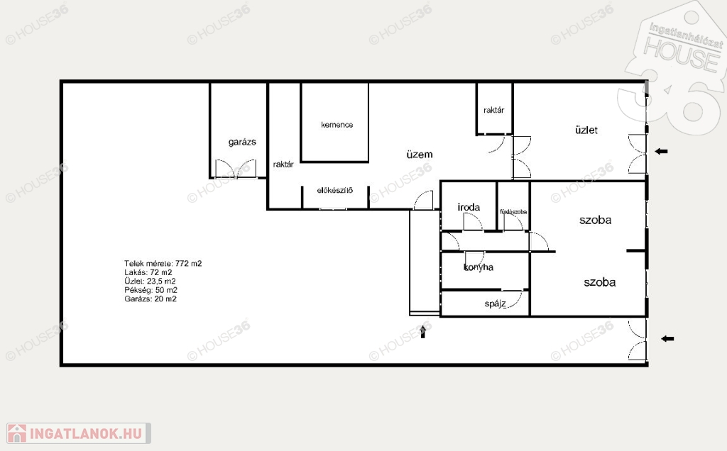- Pékség: 50 m2 (2 raktár, előkészítő, sütőkemencés helység)