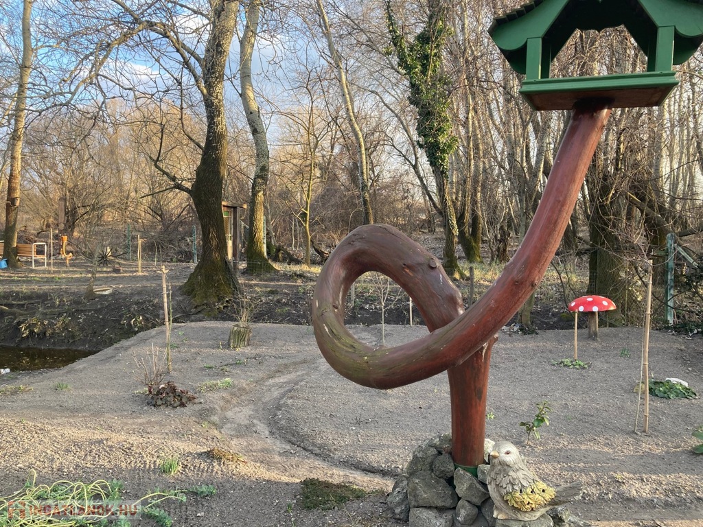 A madárcsicsergős, óriás fákkal övezett parkos udvarban egy természetes tavacskát is találunk.
