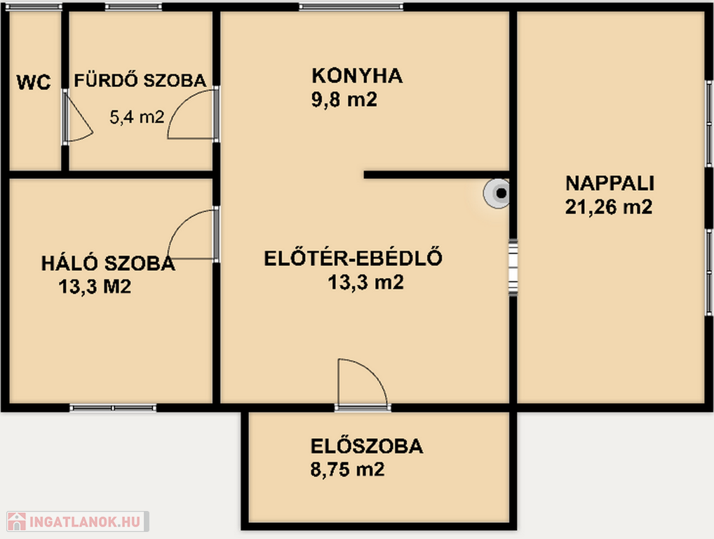 Helyiségek: nappali, konyha ebédlővel, hálószoba, fürdőszoba és külön WC.