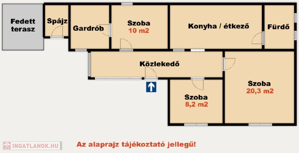Az elrendezés ideális: három szoba, gardrób, fürdő, konyha-étkező, spájz és közlekedő. A fedett terasz kellemes hangulatot ad.