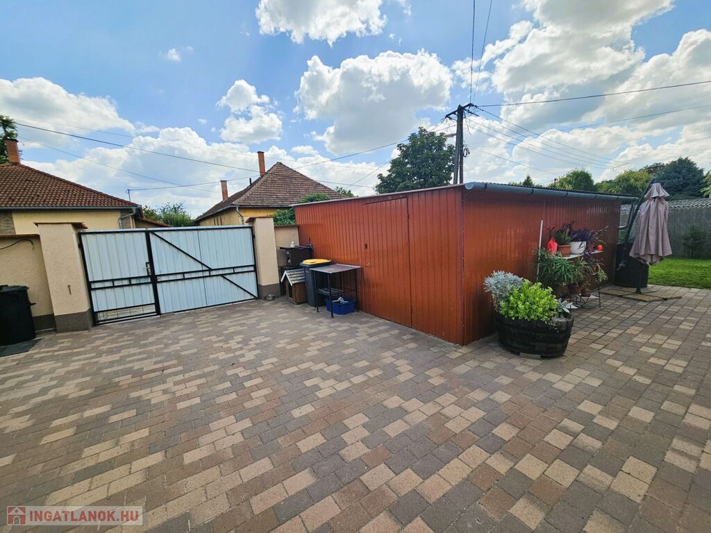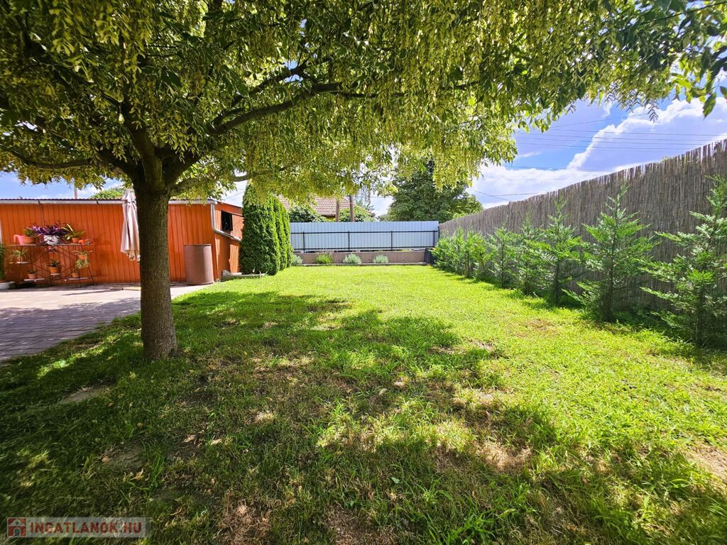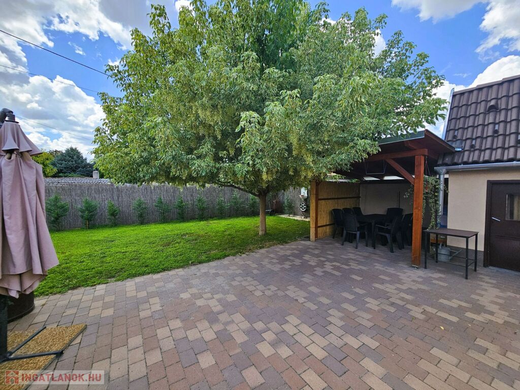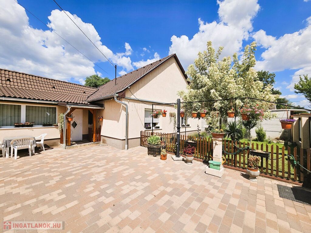 Az udvar rendezett, térkövezett, virágos részekkel, tuják és flamingó juharok árnyékot adnak, öntözés kerticsappal és fúrt kúttal megoldható.