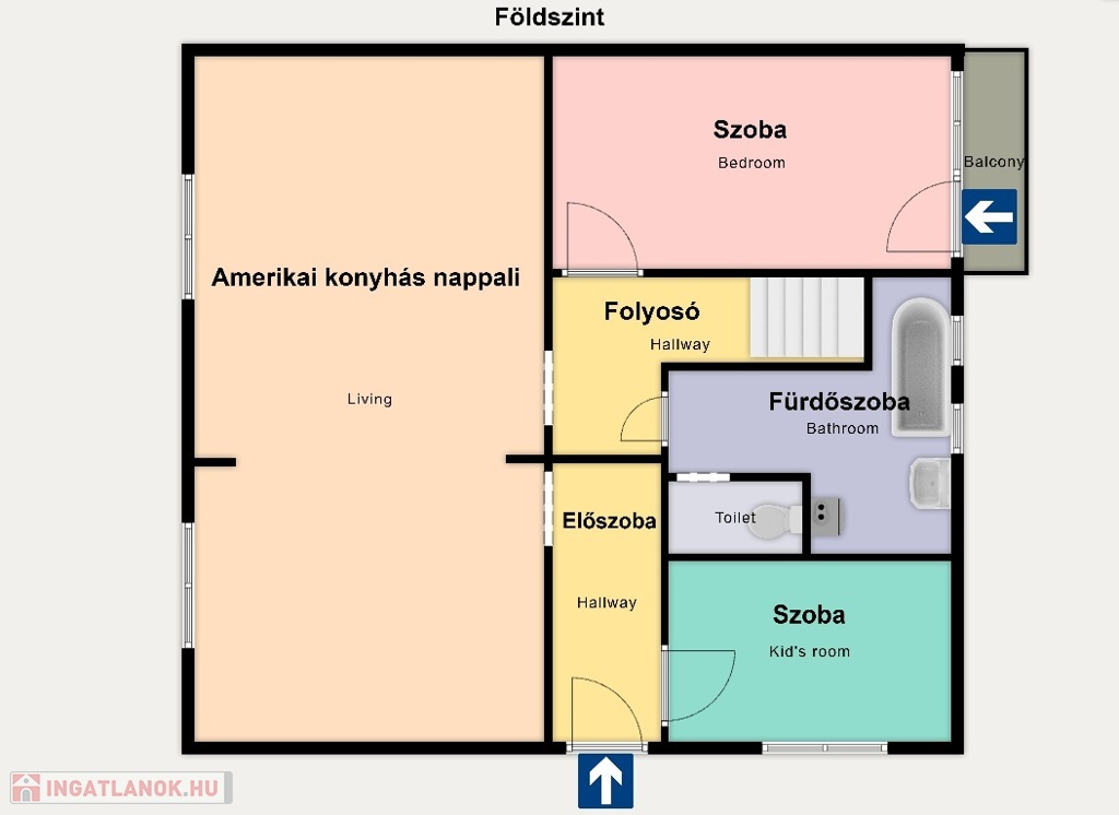 Az ingatlan földszintjén 2 szoba, amerikai konyhás nappali, fürdőszoba káddal, egy különálló wc, az épület elején és belső udvari részén fedett terasz található. Az emeleten 2 szoba, nappali, fürdőszoba zuhanyzóval és egy wc kapott helyet.