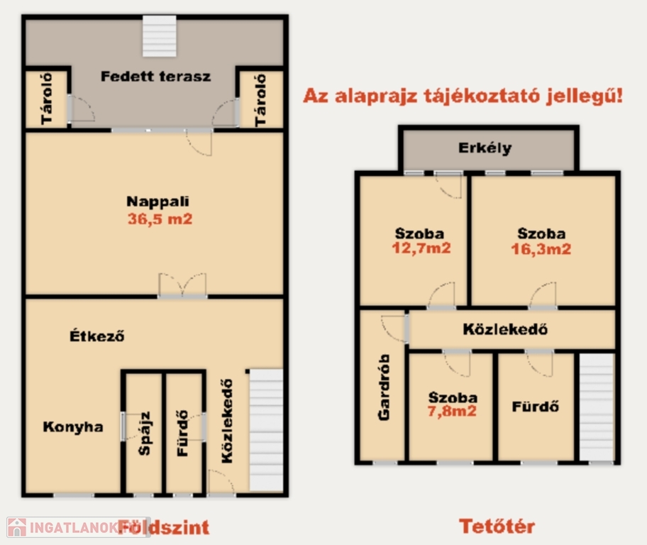 • Földszint: Tágas nappali, konyha-étkező, spájz, fürdő, közlekedő, fedett terasz.