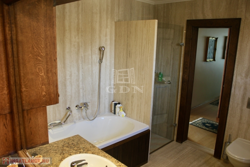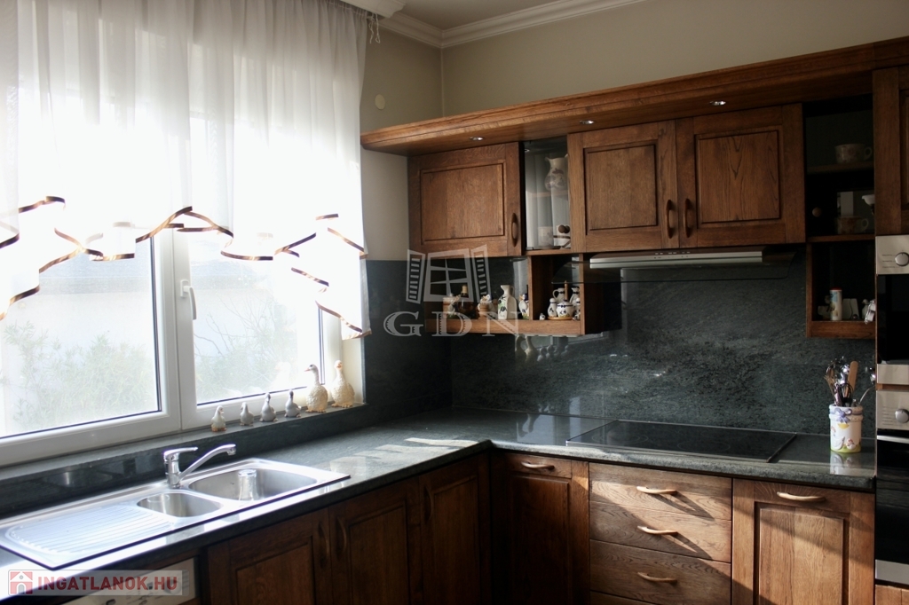 A ház belső tereit magas minőségű anyagok és megbízható műszaki megoldások jellemzik: a fürdőszobákban Laufen szaniterek, a közlekedőkben és vizes helyiségekben gránit burkolatok, míg a szobákban parketta és laminált padló található. A tölgyfából készült beltéri ajtók, a konyhabútor, a lépcső és a beépített gardróbszekrények egyedi kivitelezésűek. A földszinti nappaliban beépített kandalló és stílusos bárszekrény pedig tovább erősíti az otthon meleg, elegáns hangulatát.