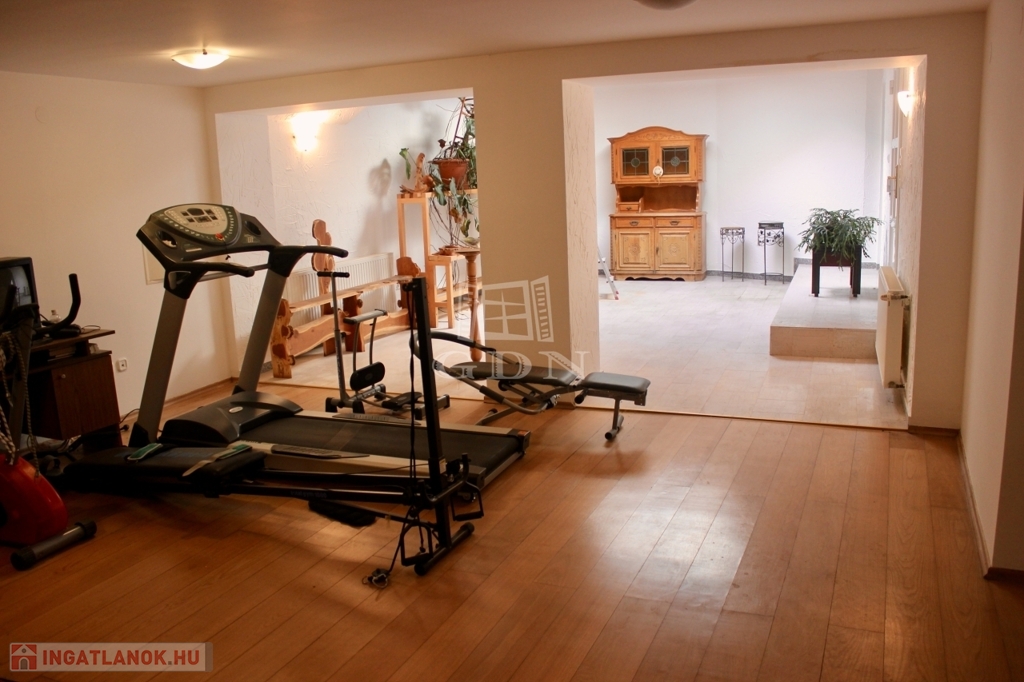 A háromszintes, igényesen megépített és folyamatosan karbantartott ház kialakítása rendkívül praktikus. A földszinten található egy előtér, WC, kamra/tárolóhelyiség, konyha, melyben beépített Miele gépek találhatóak, ezen felül egy étkezővel egybekötött nappali, egy gardrób szoba, fürdőszoba illetve egy hálószoba. Az emeleti lakótérben szintén megtalálható egy nappali rész, két hálószobával egy fürdőszobával és két beépíthető tetőtéri szobával. A szuterén szinten található a műhely, mosókonyha, egy világos télikert, fitness terem, zuhanyzó és külön WC, valamint egy gondosan kialakított wellness részleg szaunával. A ház szobáiból és a teraszról egyaránt szép kilátás nyílik a kertre, amely kellemes, zöld környezetet biztosít a mindennapokhoz.