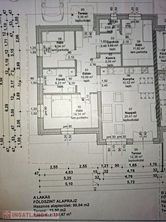 A. lakás 330,47 nm saját kerttel,: nettó 87,40 nm lakótérrel, melynek helyiségei: előszoba 10,09 nm, kertkapcsolatos amerikai konyha nappali 30,93 nm, hálószoba 11,62 nm, hálószoba 14,34 nm, hálószoba 9,04 nm, fürdőszoba/wc 6,23 nm, wc 2,05 nm,gardrób 3,69 nm, kamra 2,05 nm, terasz 15,90 nm.
