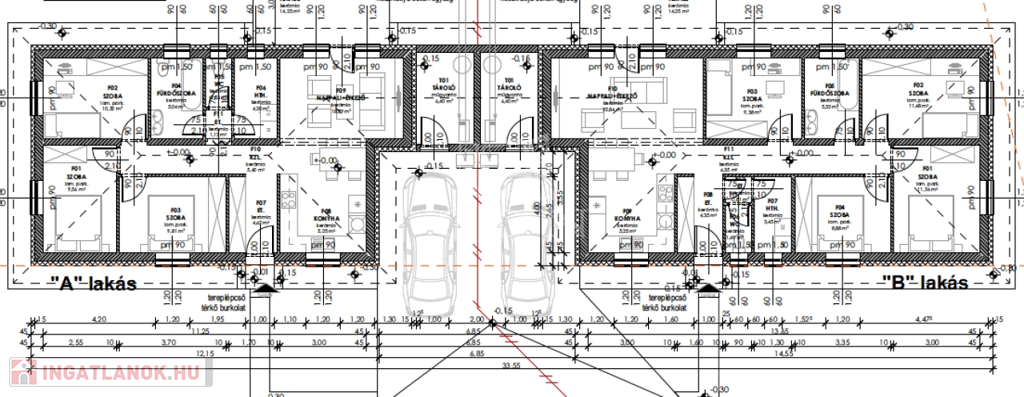 A két ikerházfél egymás tükörképe, az egyetlen különbség, hogy a B házhoz nagyobb telek tartozik.