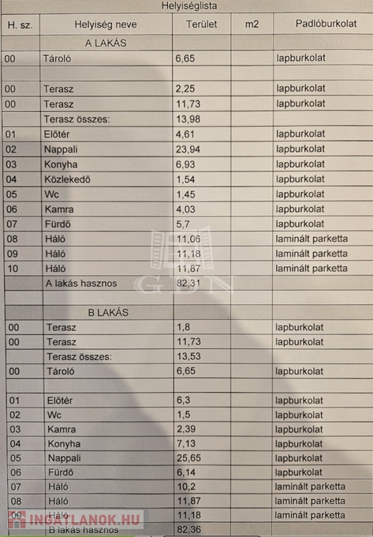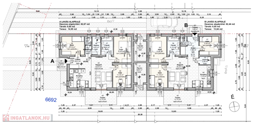 A 3 hálószobás ingatlanok nettó alapterülete: 83 nm + tároló: 6,65nm + terasz: 12,00 nm.