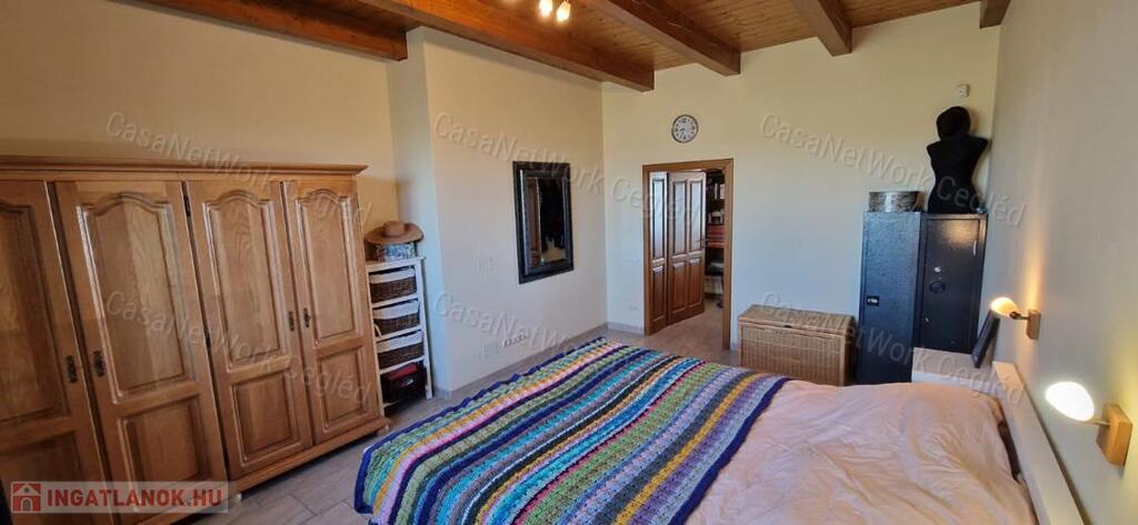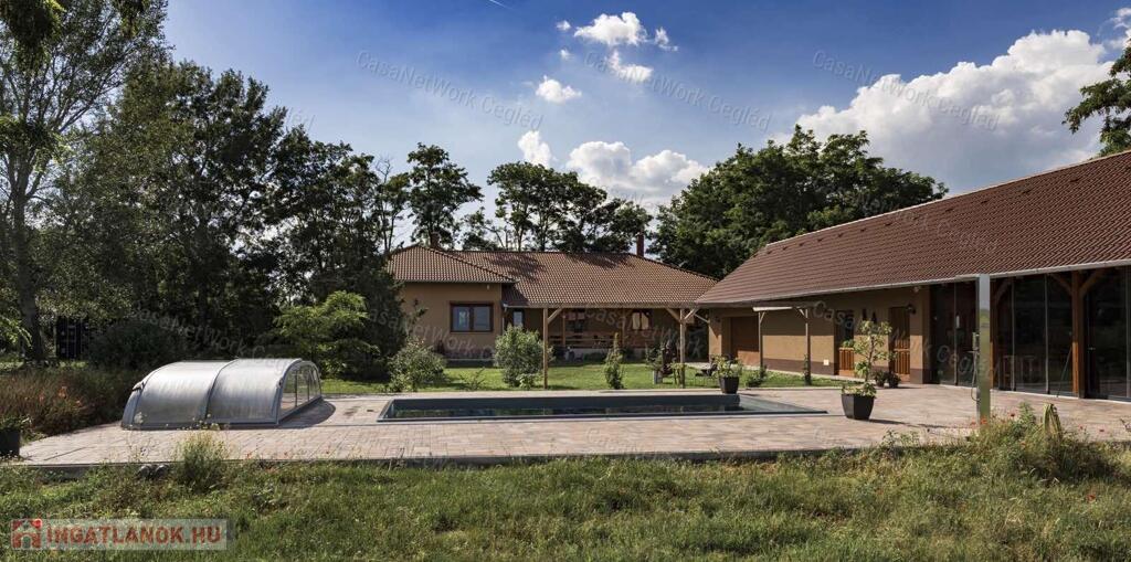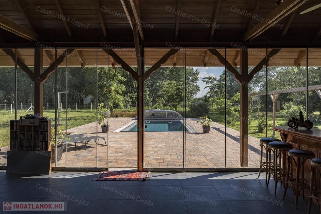 -VENDÉGHÁZ alapterülete: 97,5 nm, hőszigetelt Phorotherm falazattal, cserép borítású tetővel, belmagassága: 2,7 m, 1 szoba (jelenleg műhelyként funkcionál), WC, konyha-nappali elrendezésű. A központi tere eltolható üveg tolórendszerrel ellátott, így ez a tér teljesen nyitottá varázsolható. Fűtése gázcirkó kazánnal, lapradiátorokkal megoldott. A melegvizet villanybojler szolgáltatja. A nappali részében egy bárpult kapott helyet. Az ingatlanban 3 fázis 220 Volt, 32 Amper.