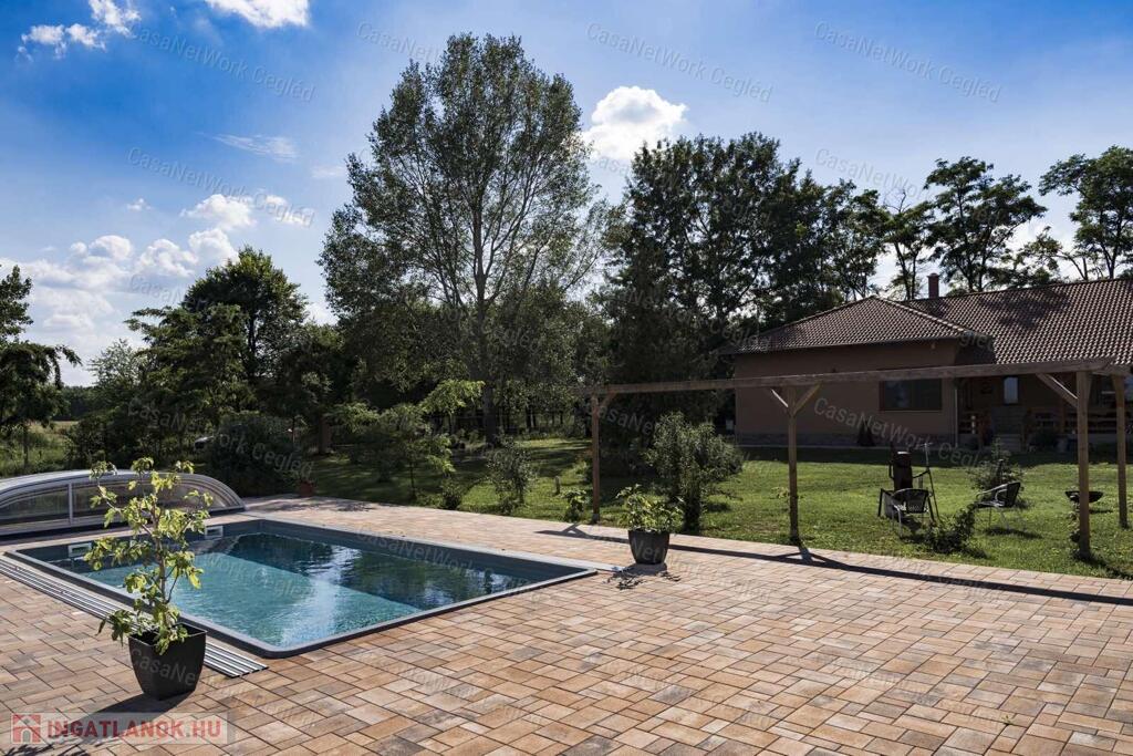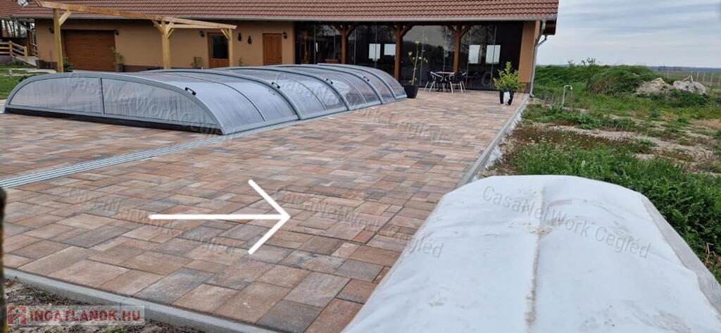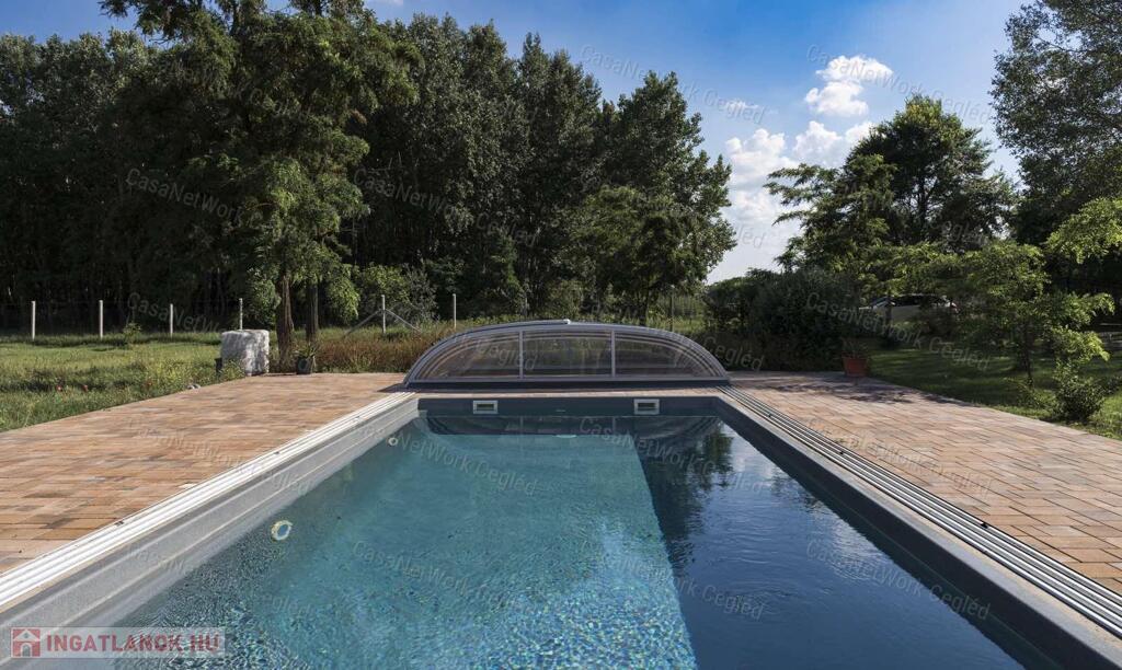 -MEDENCE : Hossza: 8m, szélessége: 4 méter, mélysége 1,5 m. Külön szivattyúval, szivattyúházzal, szervízkamrával, időkapcsolóval, automata vízforgatóval, kemikáliákkal, saját megvilágítással, medence borítással. A mellette egy villanyárammal ellátott kerti zuhany is helyet kapott. A medence gépkamrájában 220 Volt és 400 Volt, 25 és 16 Amper áll rendelkezésre.