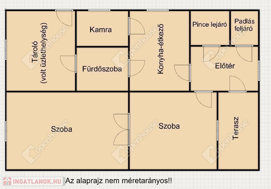 Tágas konyha-étkező, két nagy méretű szoba, fürdőszoba WC-vel, előtér, valamint egy külön bejárattal rendelkező helyiség, amely korábban üzletként funkcionált – így kiváló lehetőséget kínál akár vállalkozás indítására, akár egy önálló lakrész kialakítására.