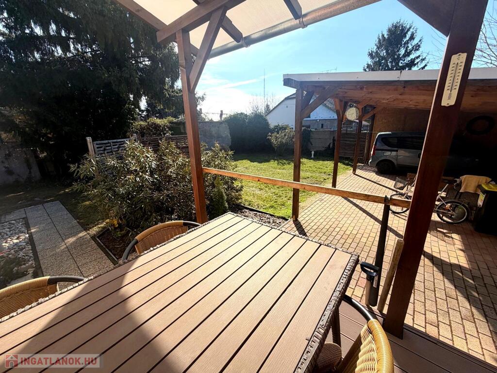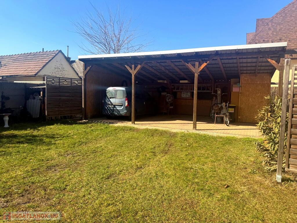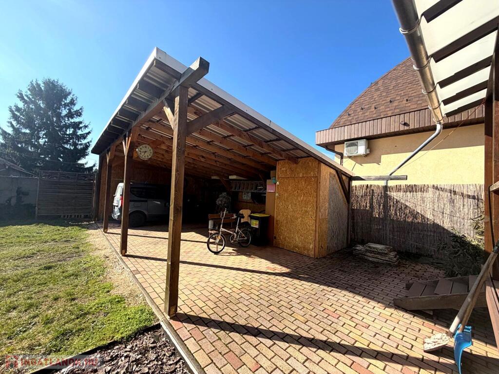 A 445 m²-es telek élhető méretű, könnyen karbantartható, rendezett és körbekerített. Egy kétállásos fedett kocsibeálló és egy kerti tároló tovább növeli a praktikumot, a részben térkövezett beálló pedig kényelmes parkolást biztosít.
