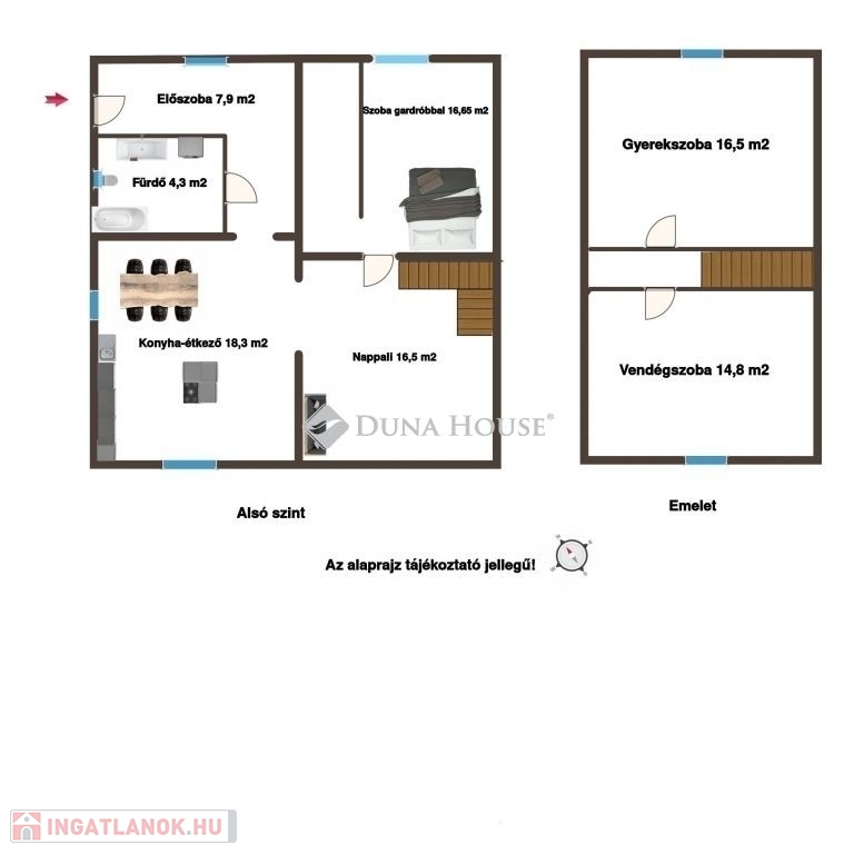 Földszint: előszoba, konyha, étkező, gardrób, hálószoba, nappali