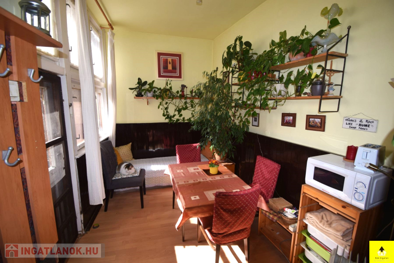Szintén a földszinten található egy 45 m2-eslakás. Itt egy utcafronti szoba, egy konyha, egy kamra, egy közlekedő, fürdőszoba wc-vel és egy zárt veranda került kialakításra.