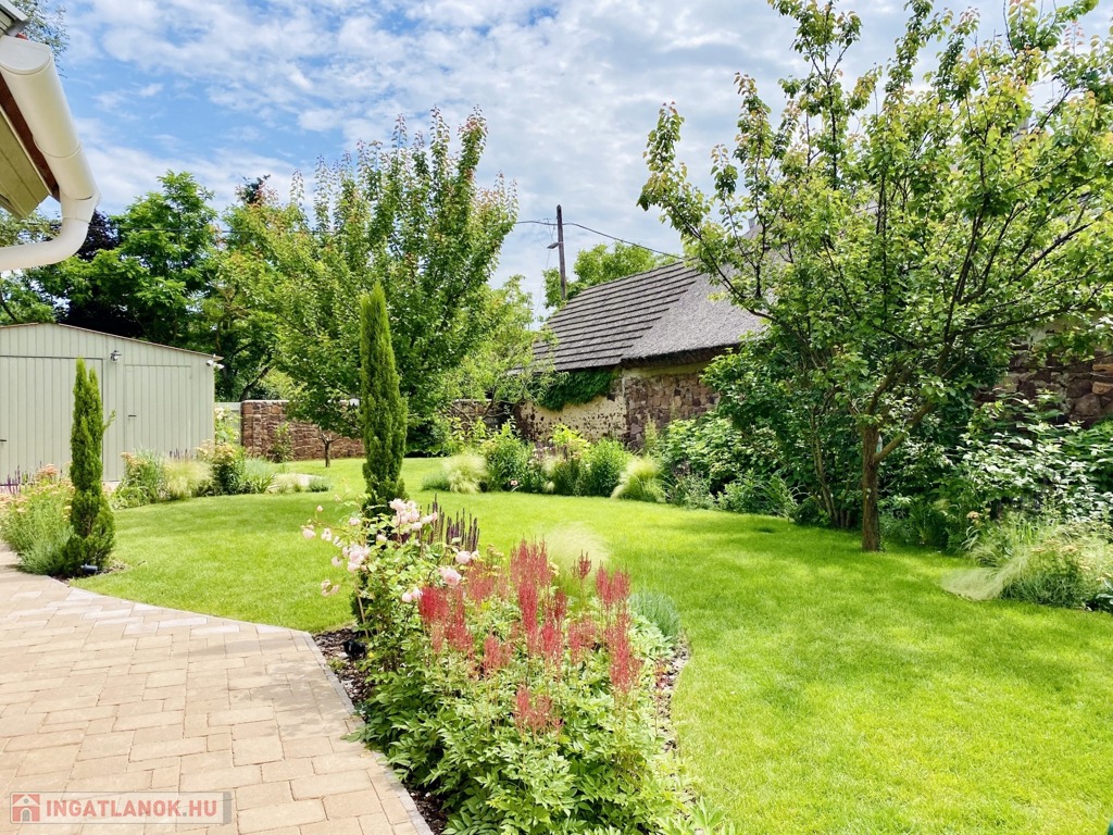 A 658 m2-es teleknek két bejárata van, parkolás az udvaron két gépjármű számára lehetséges, az első oldala felől elektromos kapuval határolt, a másik bejárata egy zsákutcába torkollik. Kertje maga a zöld oázis, mely kertrendező által tervezett különleges fűszer- és formanövényekkel betelepített, öntözőrendszerrel ellátott.