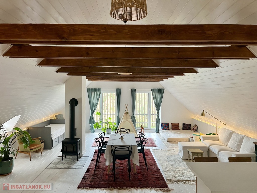 Az emeleti lakótér külső lépcsőn, az udvaron keresztül közelíthető meg, összesen 60 m2 alapterületű, egy légtér, köszönhetően a 4 m-es belmagasságnak. Itt egy szigetes konyha és egy zuhanyzós fürdőszoba került kialakításra. 2024-ben építette be a tulajdonos a tetőteret, falazata Porotherm tégla, 10 cm-es külső szigeteléssel. Az épület betonfödémes, a felújítás alkalmával teljes hájazatcserén esett át, fedése hódfarkú cserép. Fűtéséről Jotul norvég kandalló, klíma és pár fali panel gondoskodik, melegvízellátásáról pedig egy 100 literes villanybojler.