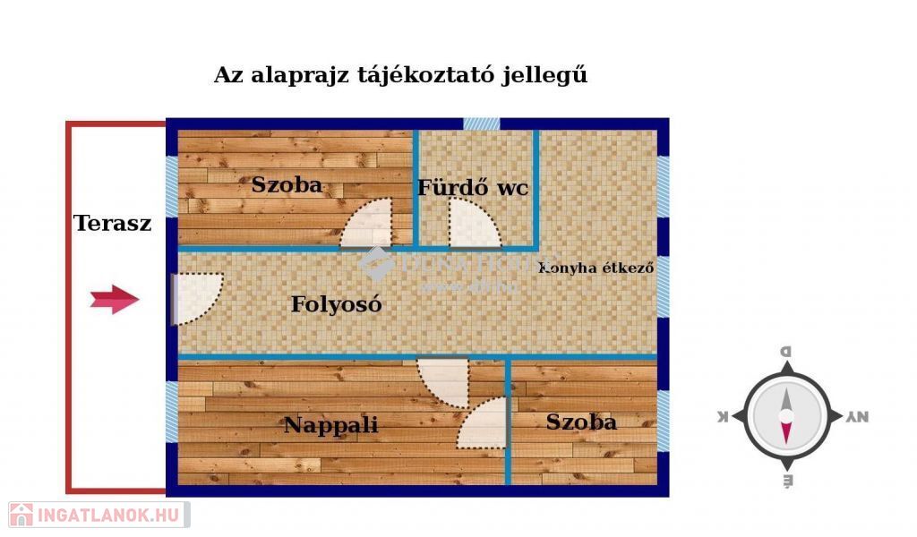 A házban található 2 szoba, hatalmas tágas nappali , konyha-étkező, fürdőszoba- wc. A ház fűtését konvektorok biztosítják.
