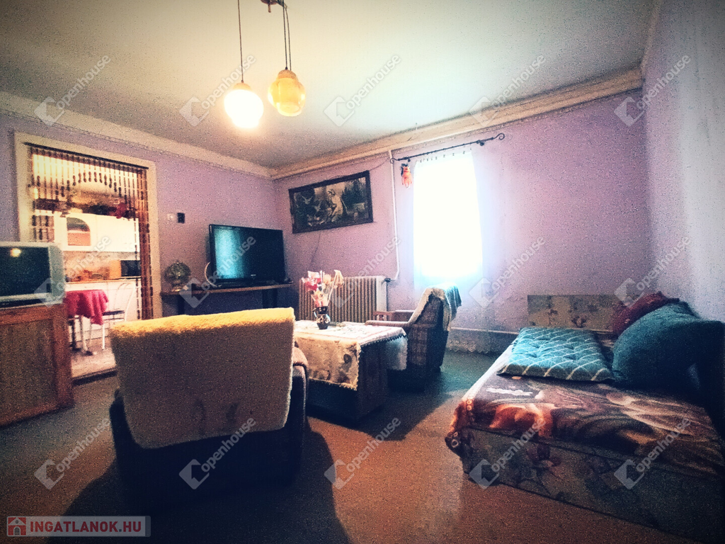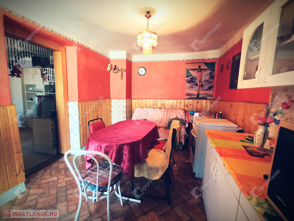 A főépület 90m²-es, vegyes falazatú, jelenlegi elosztása szerint három szoba, két konyha és egy fürdőszoba található benne. Két bejárattal rendelkezik, így több generációs családoknak vagy összeköltözőknek is ideális választás lehet. Az ingatlanban két külön villanyórát alakítottak ki. A fűtést fatüzelésű központi fűtés biztosítja. A tető 2000-ben felújításra került, jelenleg is jó állapotú.