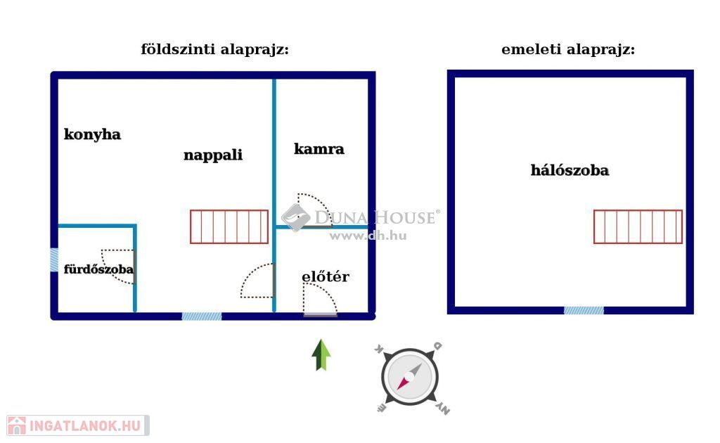 A földszinten egy amerikai konyhás nappali és egy fürdőszoba wc-vel, valamint egy kamra található, az emeleten egy hálószoba.