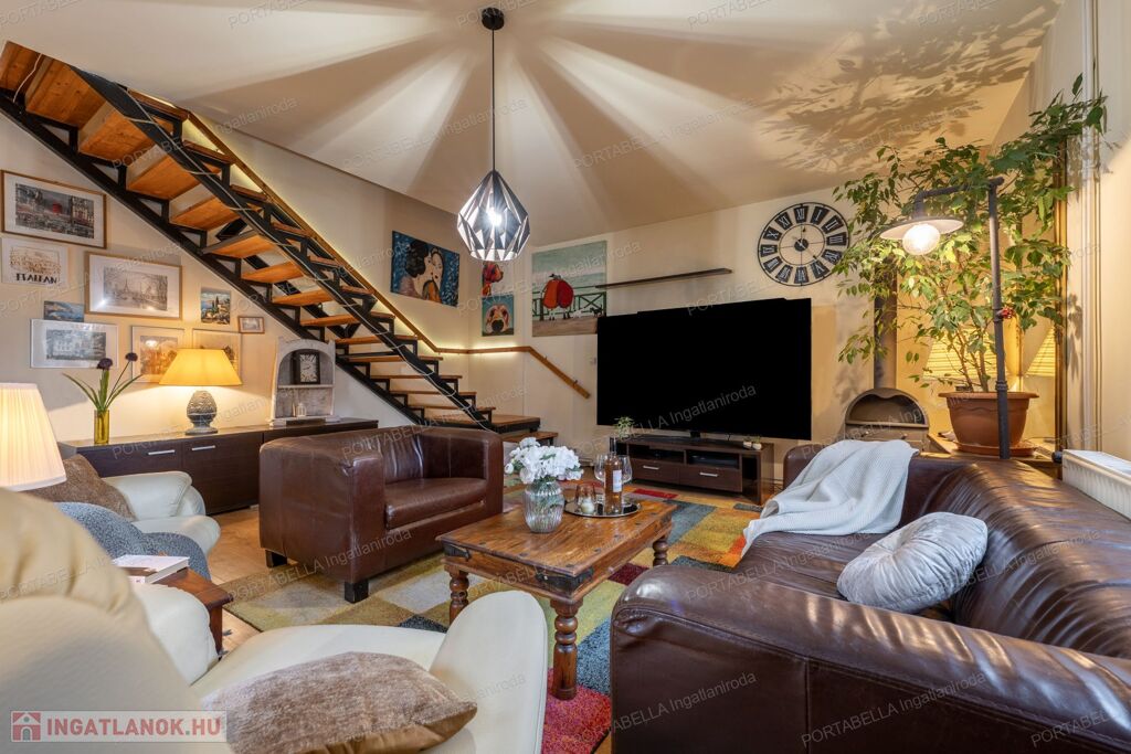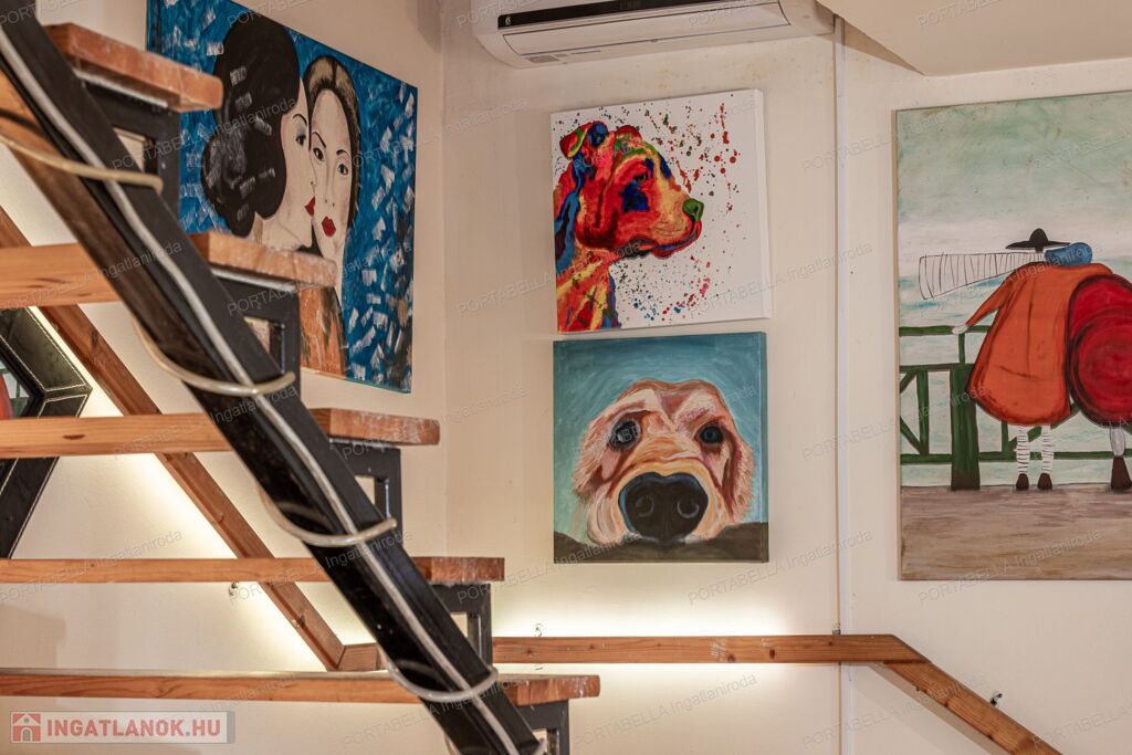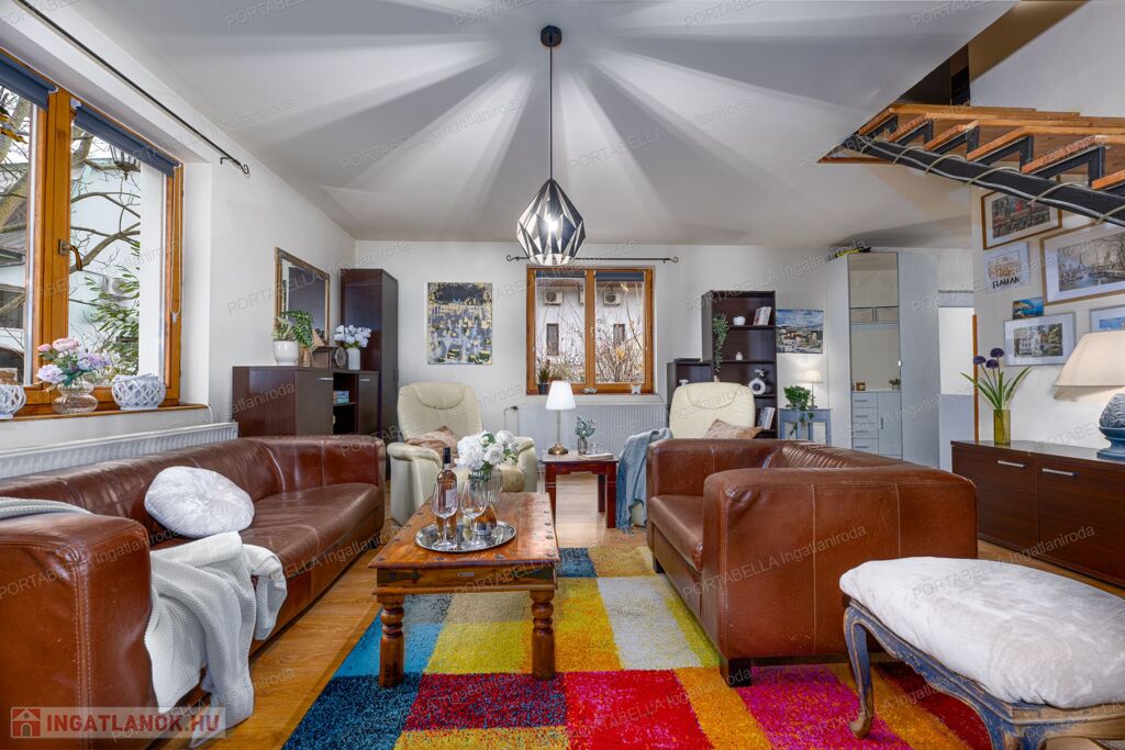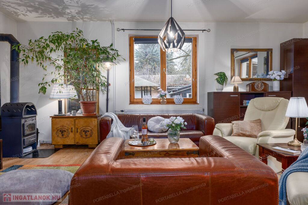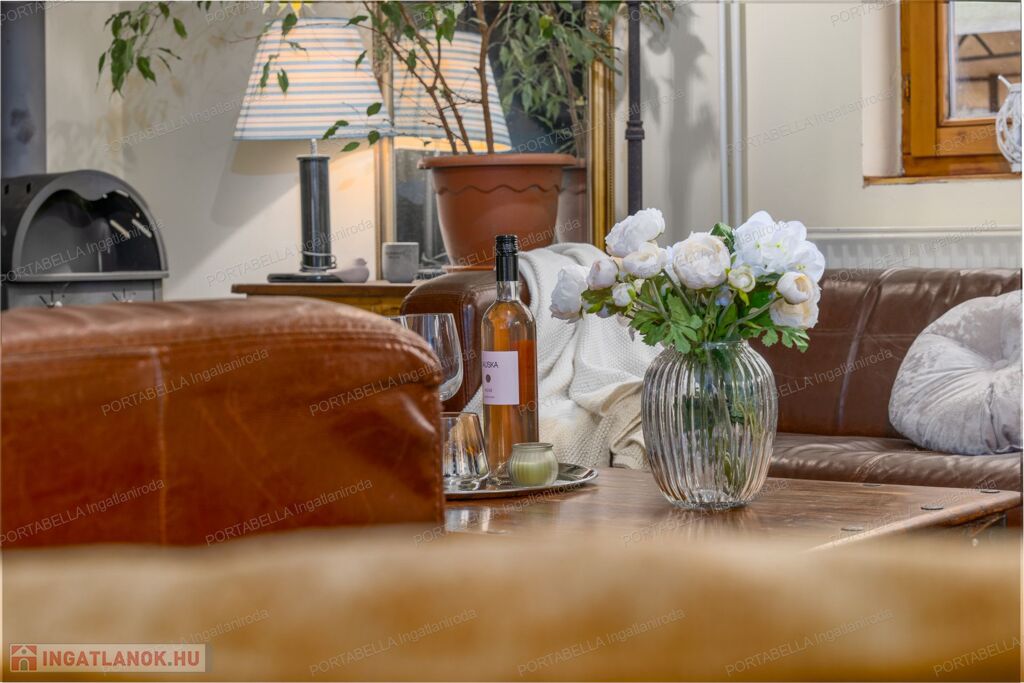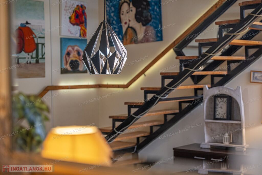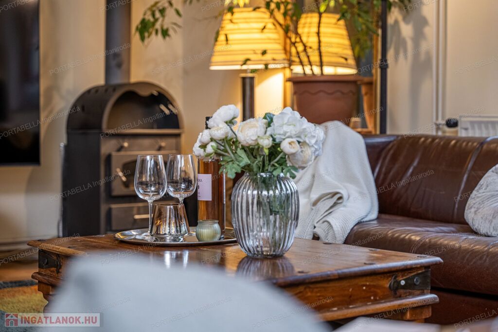 A 165 négyzetméteres lakótér tágas elosztású, különösen a hatalmas nappali emelkedik ki. Négy hálószoba és két fürdőszoba biztosít kényelmet a nagy családoknak is. A nappaliban kandalló gondoskodik az otthonos hangulatról. A konyha modern és jól felszerelt, fa dupla üvegezésű nyílászárókkal. Az ingatlan fűtését gáz cirkó biztosítja radiátorokkal.