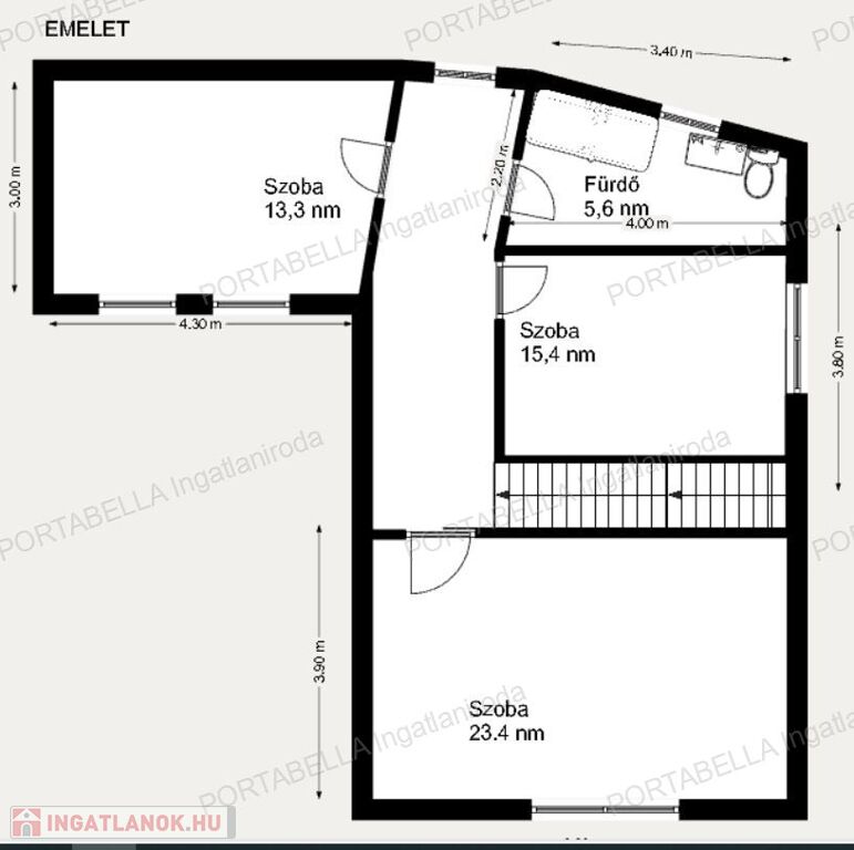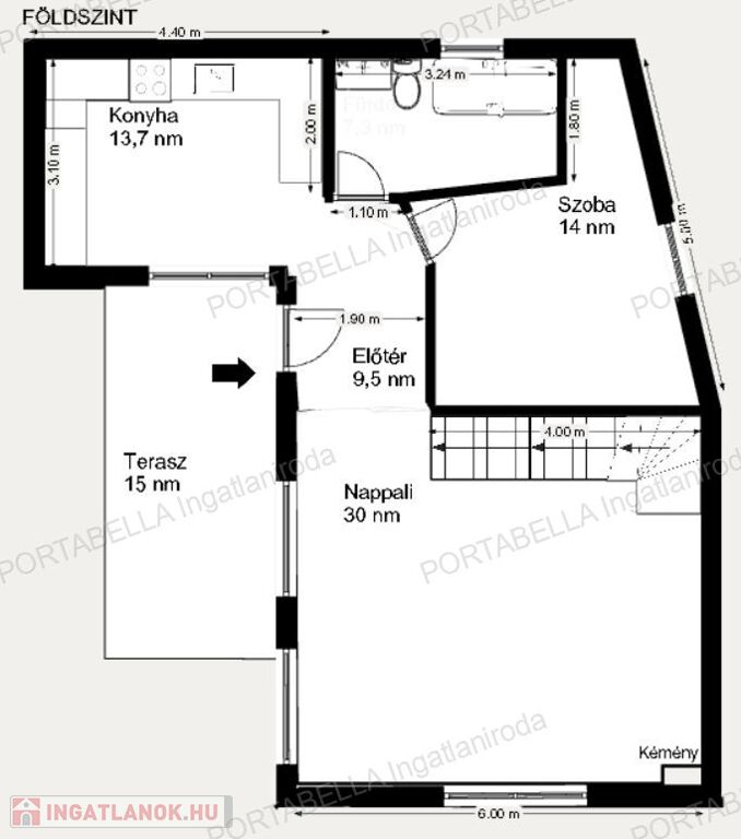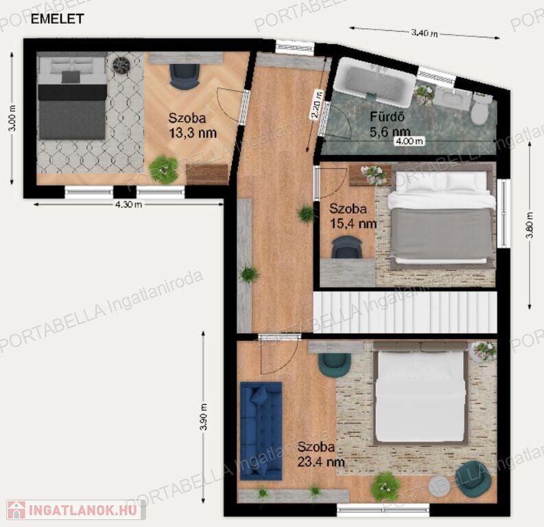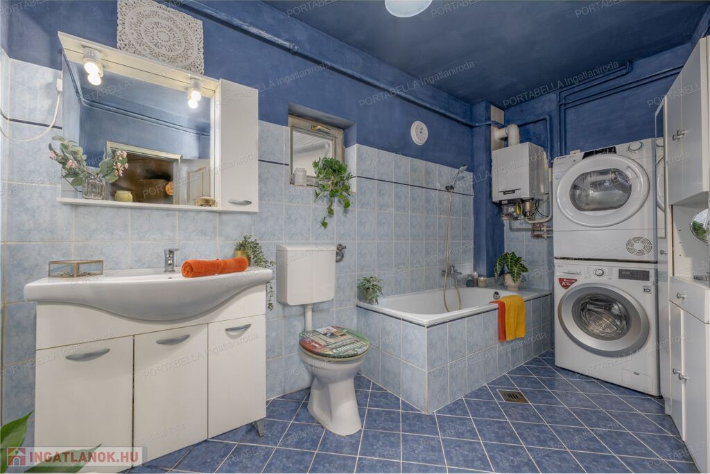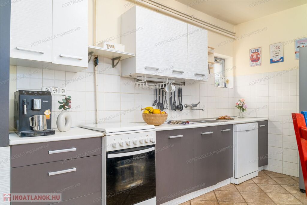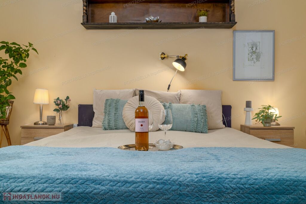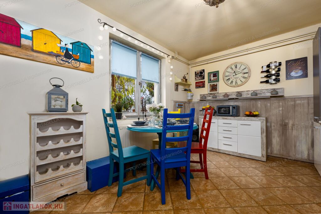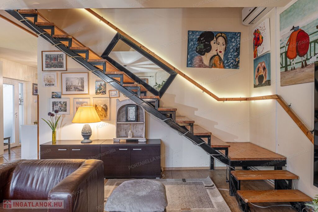 A 165 négyzetméteres lakótér tágas elosztású, különösen a hatalmas nappali emelkedik ki. Négy hálószoba és két fürdőszoba biztosít kényelmet a nagy családoknak is. A nappaliban kandalló gondoskodik az otthonos hangulatról. A konyha modern és jól felszerelt, fa dupla üvegezésű nyílászárókkal. Az ingatlan fűtését gáz cirkó biztosítja radiátorokkal.