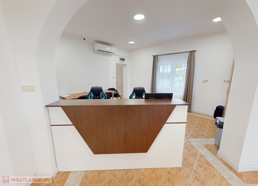 A földszinten találhatunk egy hatalmas nagy teret. Gyönyörű szép burkolattal, fallal, spotlámpákkal. Gyönyörű kilátással a környezetre. Képzeljük el, hogy akár egy étteremként, akár egy bemutató teremként – attól függően, hogy mire kívánjuk használni az ingatlant – kiválóan funkcionálhat a mellette levő külön teremmel, recepcióval, és a hozzá tartozó tárolókkal együtt.